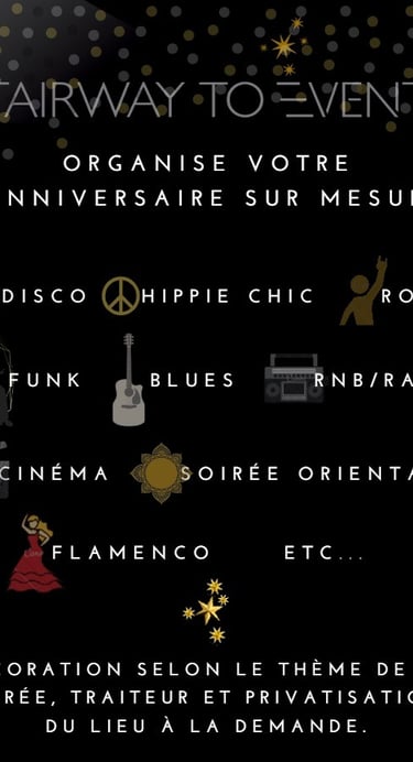 Soirée disco, woodstock, pin-up, latino, rock, bohème chic, automnale, Jazz, blues, punk... laissez libre cours à votre imagination et nous ferons le reste !